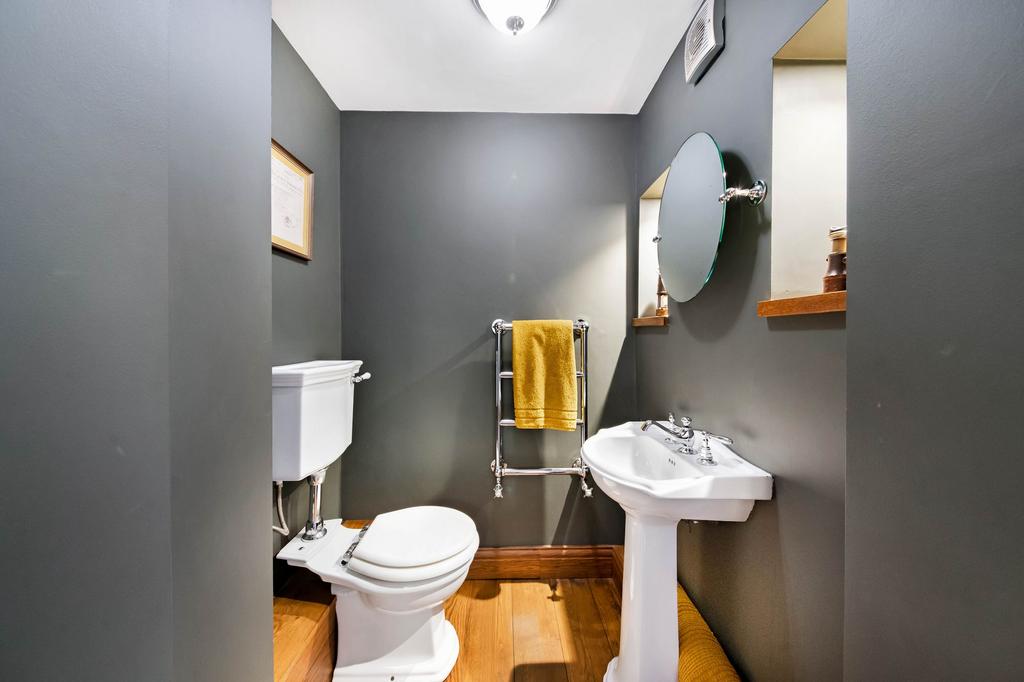 The engineered oak flooring with underfloor heating continues through to the downstairs W.C. which features a traditional style two-piece suite comprising of a low-level W.C. with raised cistern and a pedestal wash hand basin with chrome taps. There are two recessed shelving areas with inset spotlighting, an extractor fan, central ceiling light point and a wall mounted chrome ladder style radiator.