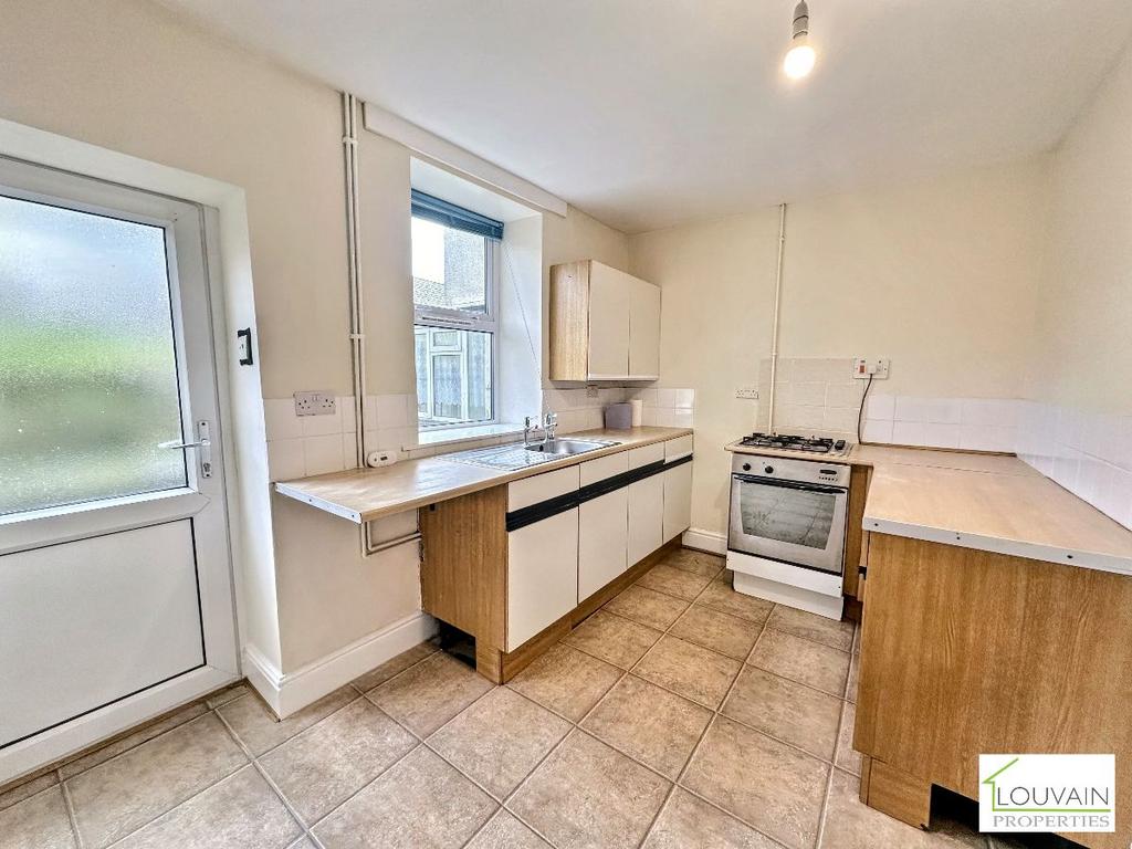 Laminate flooring. Flat plastered walls and ceiling. Wall and base units. Integrated oven and gas hob. Space for free-standing fridge/freezer and washing machine. Stainless steel sink. uPVC double glazed window. uPVC composite double glazed door. Radiator.