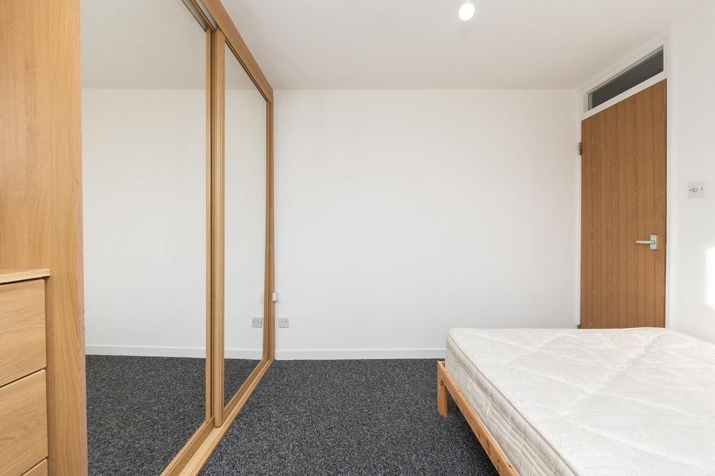 The double bedroom offers a peaceful retreat, complemented by floor-to-ceiling mirrored wardrobes that provide excellent storage while maximising both space and brightness. The bathroom features a full-sized bath with an overhead electric shower, along with a wash basin and WC.