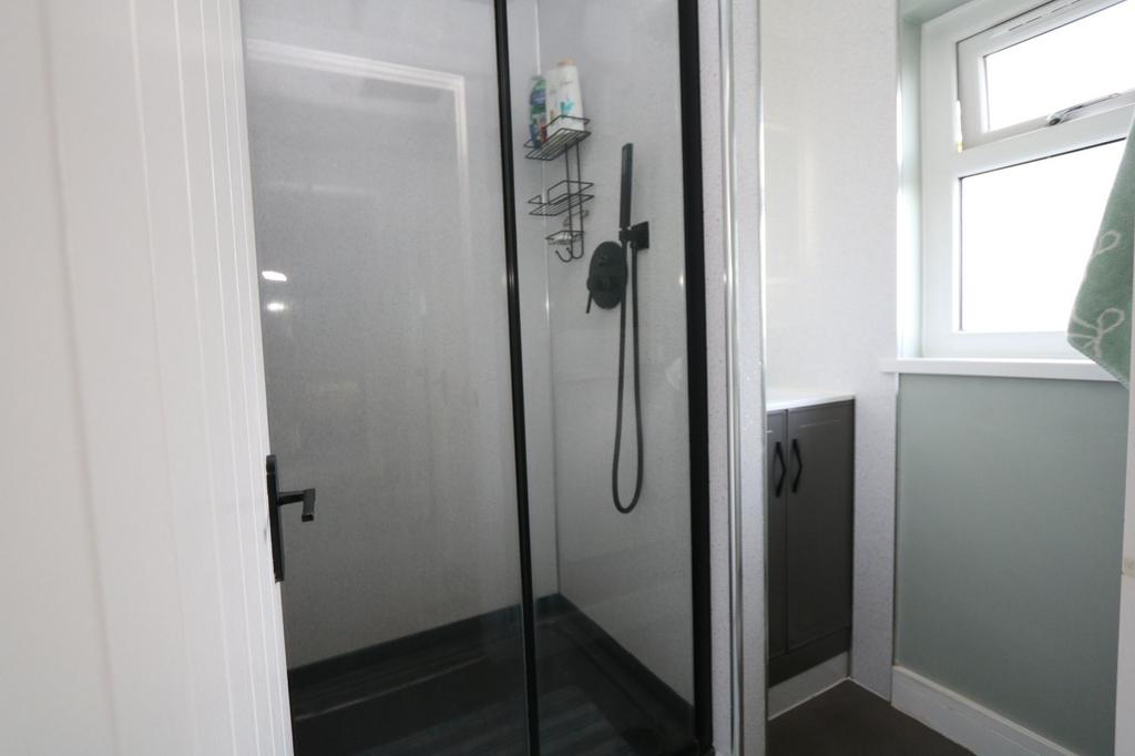 Separate shower room comprising of vinyl flooring. Double shower cubicle with modern thermostatic rainfall style shower head and separate rinse unit. Compact sink unit with storage cupboard under. Four recessed spotlights in modern panelled ceiling. Panelled splashback. Double glazed rear obscure window. Extractor fan and modern radiator.