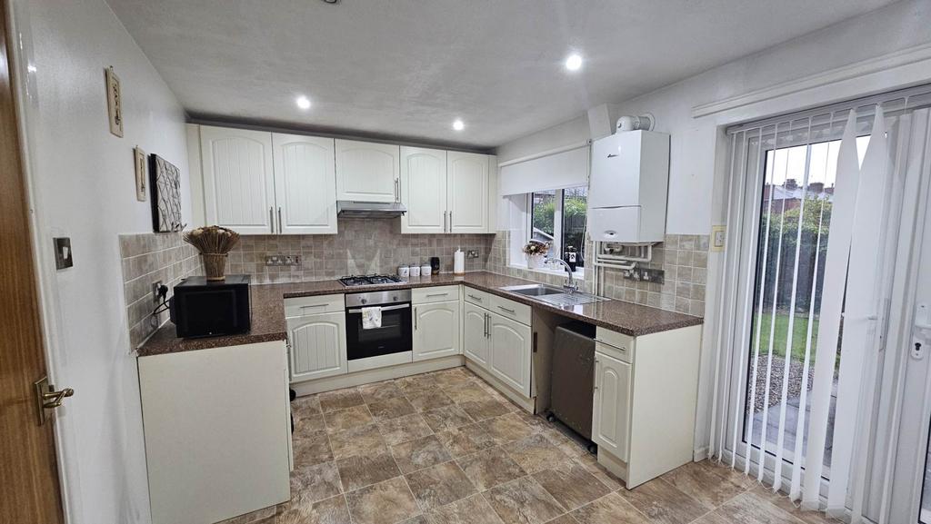 Range of wall and base units, integrated oven, four ring hob with extractor hood above, stainless steel sink unit with mixer tap, plumbed for washing machine,radiator, spotlights to ceiling and UPVC double glazed window and UPVC double glazed French doors leading to rear garden.