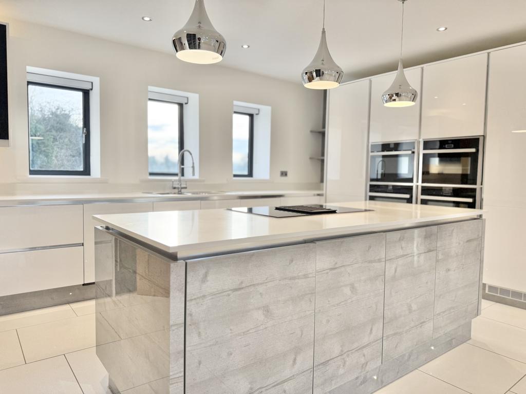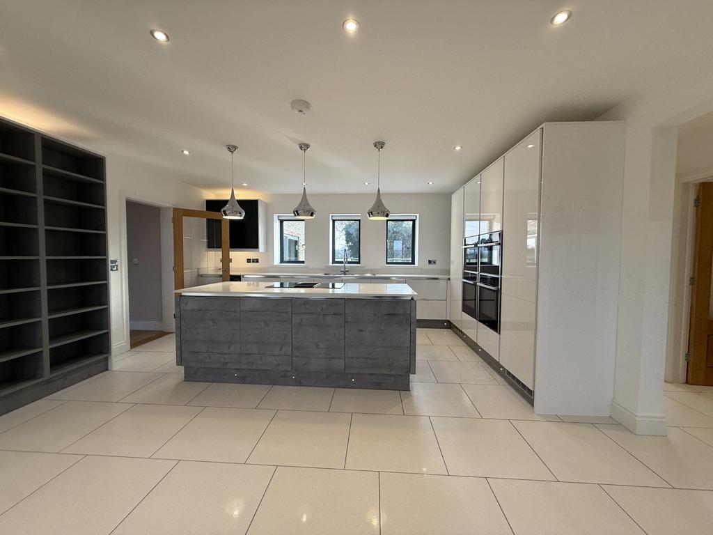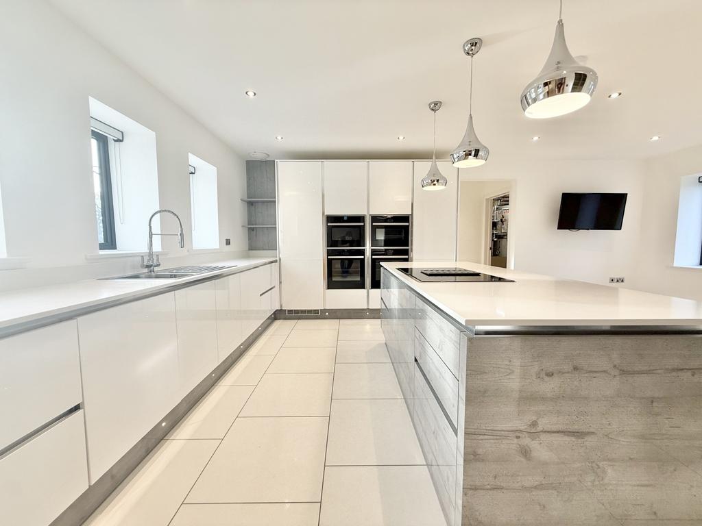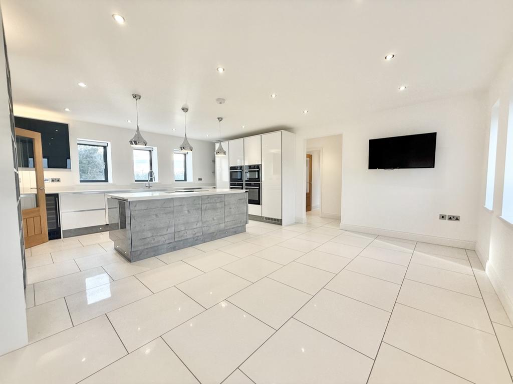 Double twin doors either side of the fireplace take you into a very generous reception room with sliding doors leading to the patio and electric remote control blinds and air conditioning being part of the modern touches. The contemporary kitchen/dining room sits adjacent to the reception hall and has a range of high gloss cabinets with a large island taking centre stage with its hob having an integral extraction system. The kitchen also benefits from having twin integral ovens, microwave, large fridge and separate freezer, dishwasher and wine cooler. A separate utility room offers further storage with a range of cabinets together with an integral tumble dryer and washing machine.