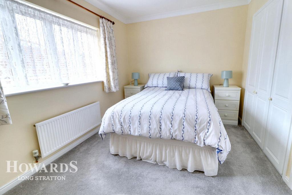 Rear aspect upvc double glazed window, triple fitted wardrobes with a mix of hanging rail and shelf space within, radiator and tv point.