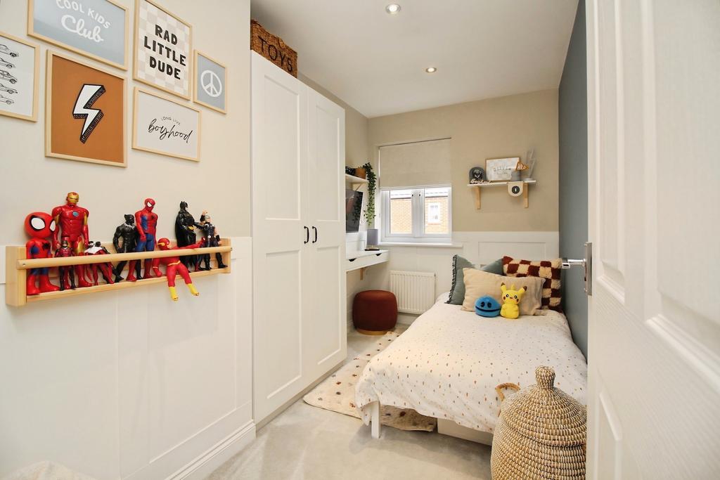 Moving upstairs, you will find three well-proportioned, neutrally decorated bedrooms, each featuring stylish half-paneled walls and spotlights. The master bedroom spans the full width of the home and is flooded with natural light from two front-facing windows. The family bathroom completes the first floor and includes a modern three-piece suite with a bath and shower over with screen, wash hand basin, and WC, complemented by tasteful tiling and a heated towel rail. The carpeted landing provides access to the insulated loft space.