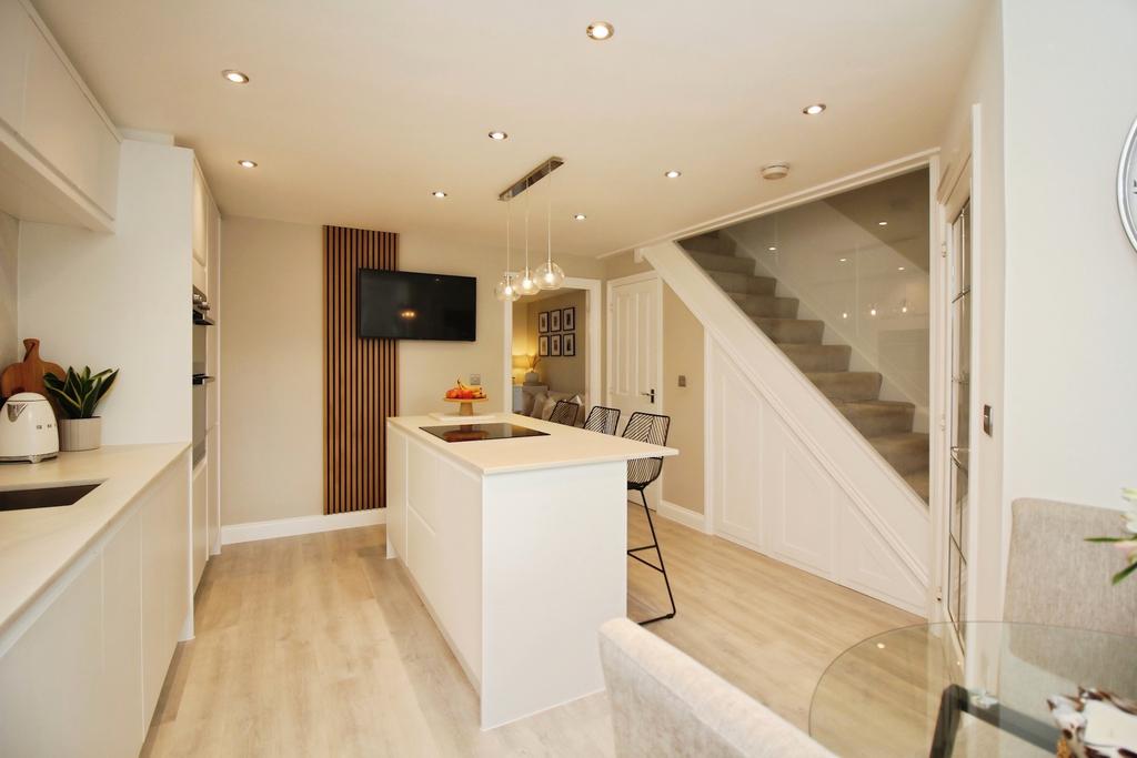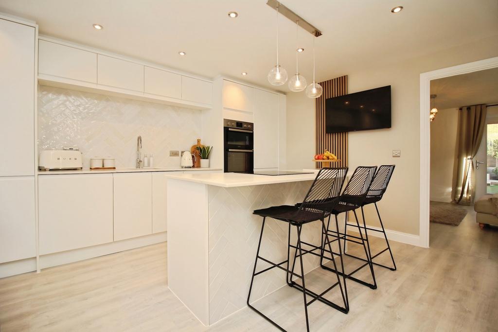 Upon entering the home, you are welcomed into a re-designed hallway with contemporary wood-effect flooring and a staircase rising to the first floor. A glazed door leads through to the stylish kitchen diner, thoughtfully upgraded by the current owners and truly the heart of the home. The kitchen is fitted with a modern range of wall and base units, complemented by Acrylic Slab Tech work surfaces, soft-close drawers, an inset sink with flexi mixer tap, built-in 'Zanussi' double oven, induction hob, integrated fridge freezer and dishwasher, plus space for a concealed washing machine. A breakfast island provides additional seating and functionality, with useful under-stairs storage and access to a guest WC. Completing the ground floor is a contemporary, full-width reception room featuring a striking media wall, dual aspect glazing, and doors leading out to the garden.