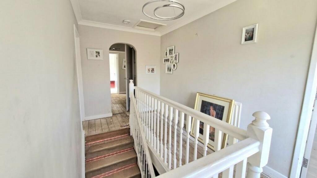 This spacious detached home occupies a sizeable plot with expansive lawns to both the front and rear, creating a strong sense of space and separation from neighbouring properties. The driveway provides ample off road parking and access to multiple garages, making it ideal for households with several vehicles or those requiring additional storage or workshop space.