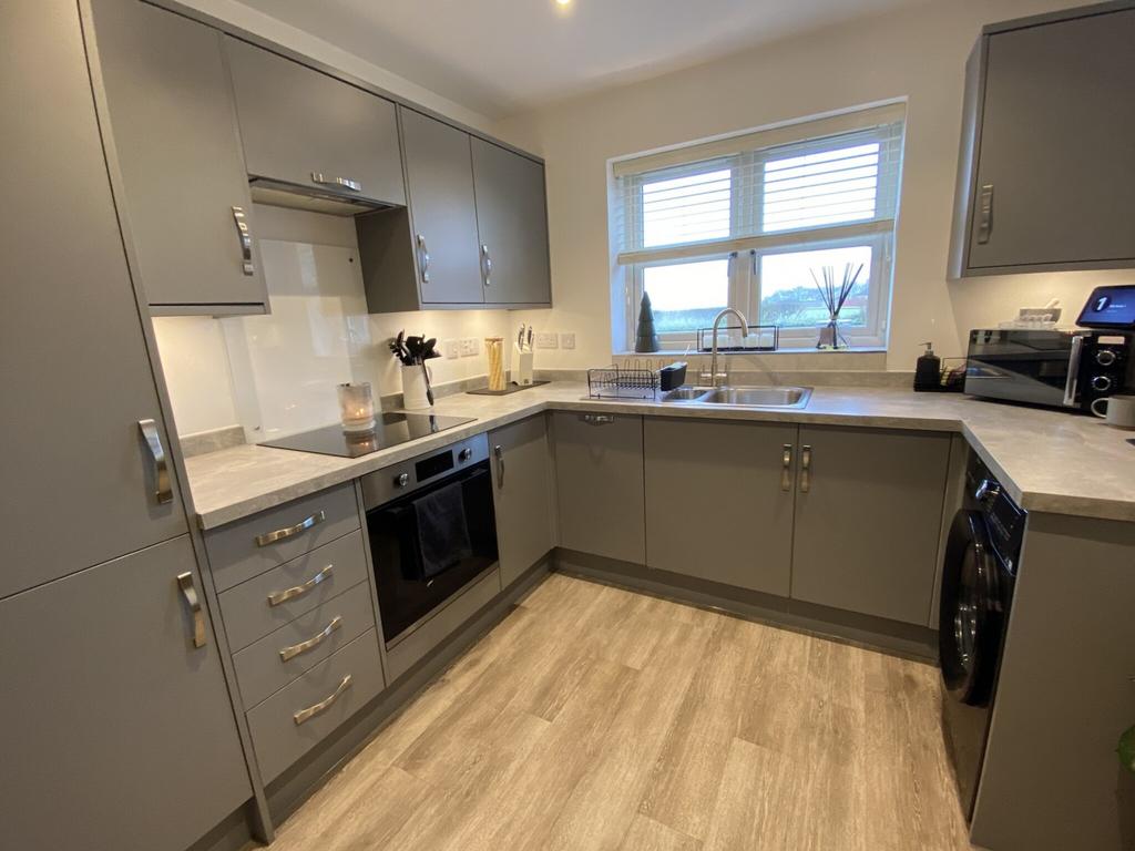 Fitted with a matching range of base and eye level units with worktop space over, 1 1/4 bowl sink unit with single drainer and mixer tap, integrated dishwasher, plumbing for automatic washing machine, space for fridge/freezer, fitted electric fan assisted oven, four ring halogen hob with extractor hood, PVCu double-glazed window to front, TV point, central heating thermostat for under floor heating, recessed ceiling spotlights.