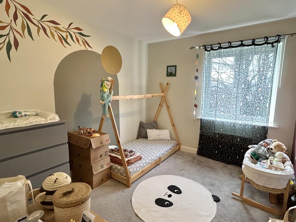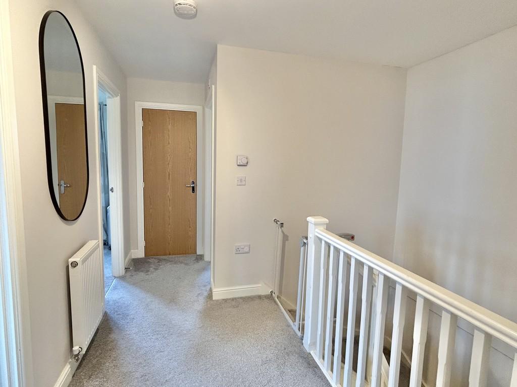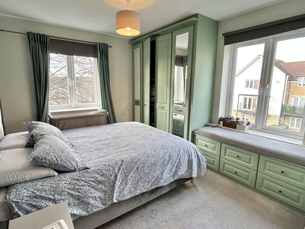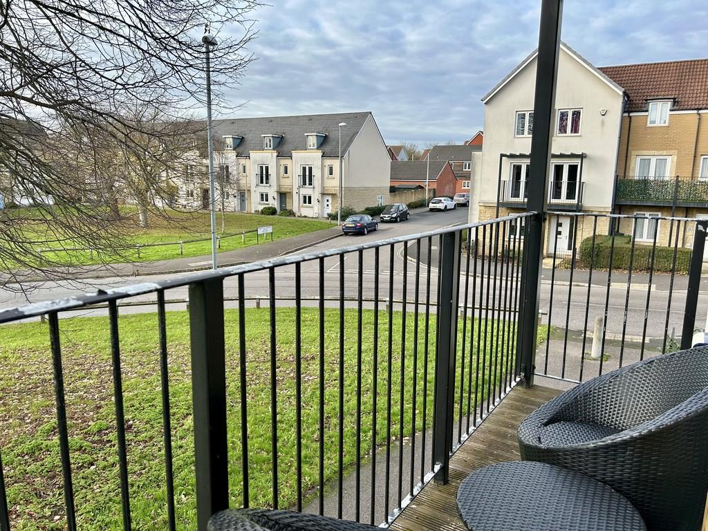 On the first floor, a bright and spacious lounge opens onto a charming front-facing balcony, offering pleasant views over the nearby green space. This level also includes a double bedroom with built-in wardrobes and direct access to a contemporary shower room.