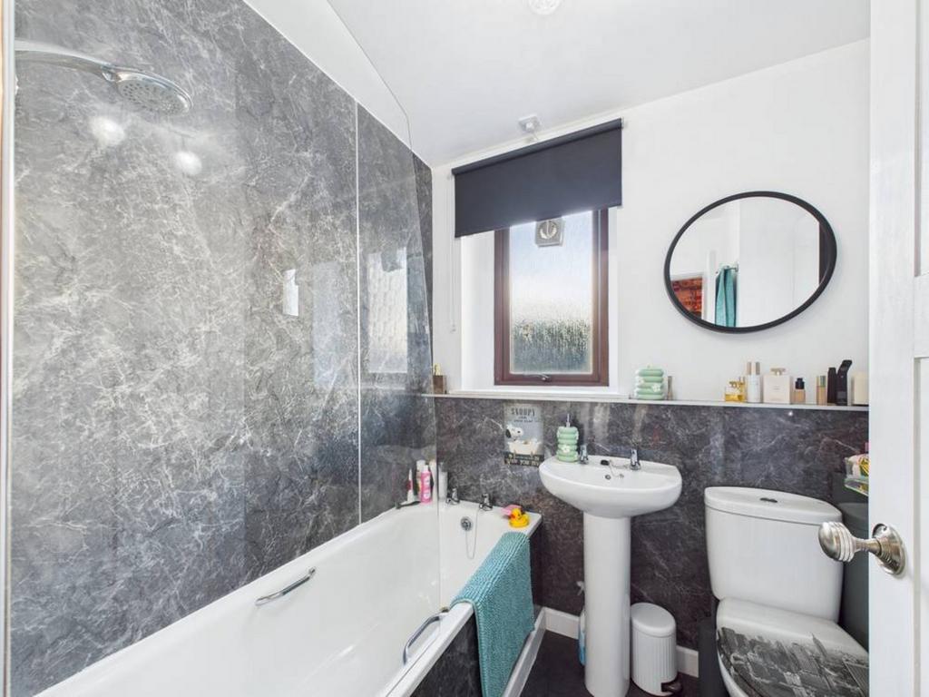 The bathroom is well proportioned and finished with a bath and shower above, privacy window, wall cabinet, radiator and modern lighting, offering everything needed for comfortable everyday living.