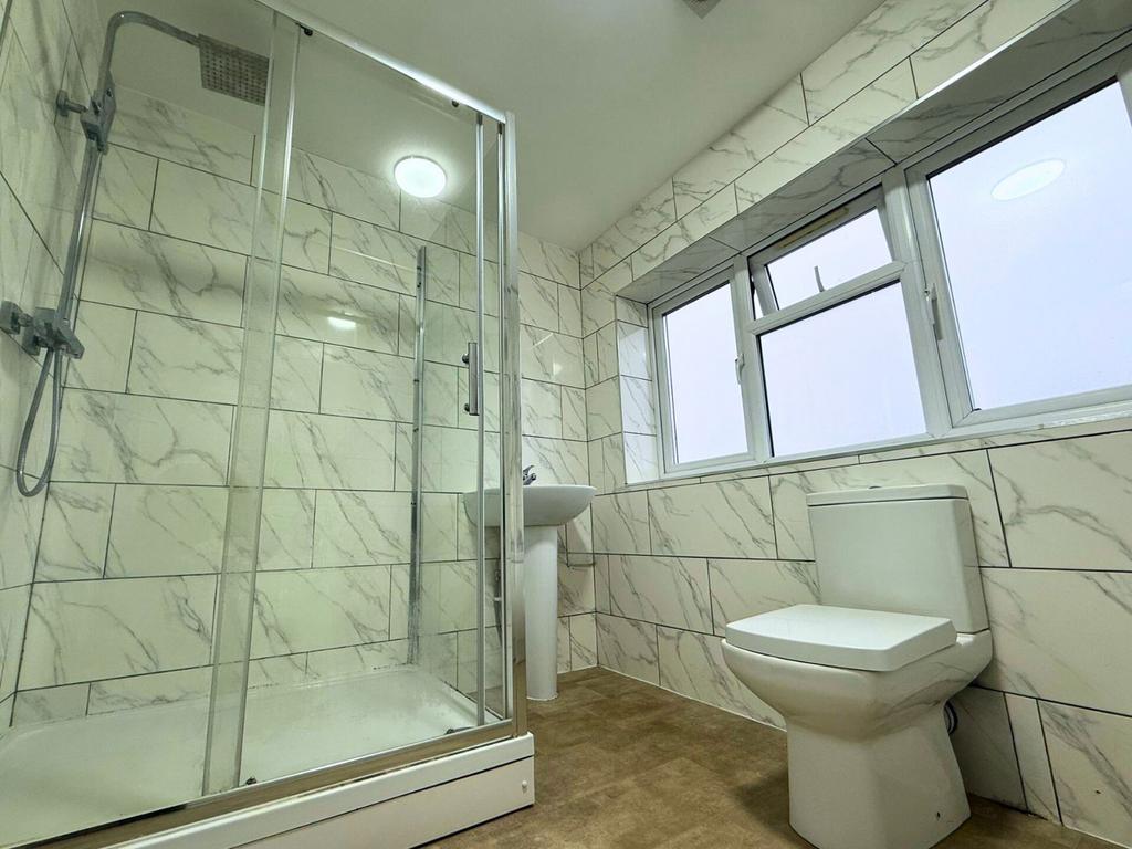 The bathroom features both a bath and a shower and is finished with modern marble-effect tiling throughout, creating a sleek and contemporary space. In addition, there is a separate WC fitted with a toilet and hand wash basin for added convenience.