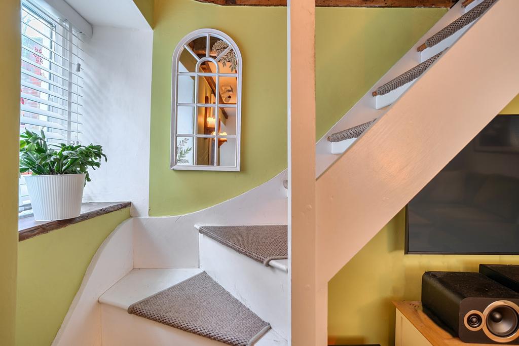 This stylish cottage is hidden away behind the old glove factory in Pilton and is part of a small enclave of properties known as 'Ladywell' which is within walking distance of 'The Rock' and Pilton Street in the historic conservation area of Pilton in Barnstaple. The property has been sympathetically updated and provides all the charm of a cottage but with the modern comforts we all enjoy. Entering the property from the south side via a half glazed Uvpc door which has a tile canopy over, into the main living area which has been cleverly screened to provide a vestibule lobby before entering into the cosy Living room with oak styled flooring, beamed ceilings, open plan stairwell and a recessed woodburner . Stylishly presented it really is a place you want to curl up on a winters night. Alongside is a separate galley kitchen with same oak styled flooring and has an inset gas hob and electric oven, timber worktops and textured white splashback tiles and a range of modern base and wall cupboards with a composite sink with mixer tap and a window over looking the rear Courtyard. Accessed via a Uvpc half glazed door the courtyard provides a private external space with boundary perimeters made of stone.