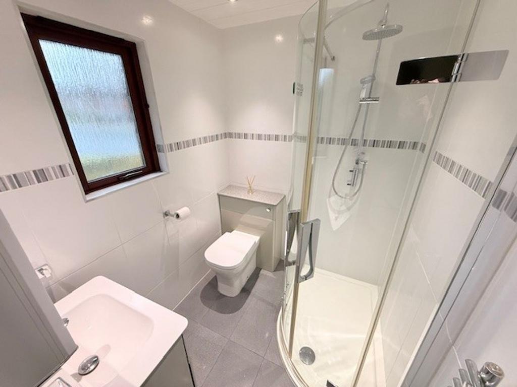 Comprising a updated suite to include double walk-in shower, clear screens. Wash hand vanity unit & mirror above. Low level wc. Tiled floor & wall. Downlighting. Chrome towel radiator. Frost DG window. Extractor fan.