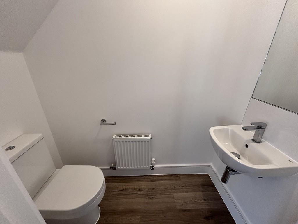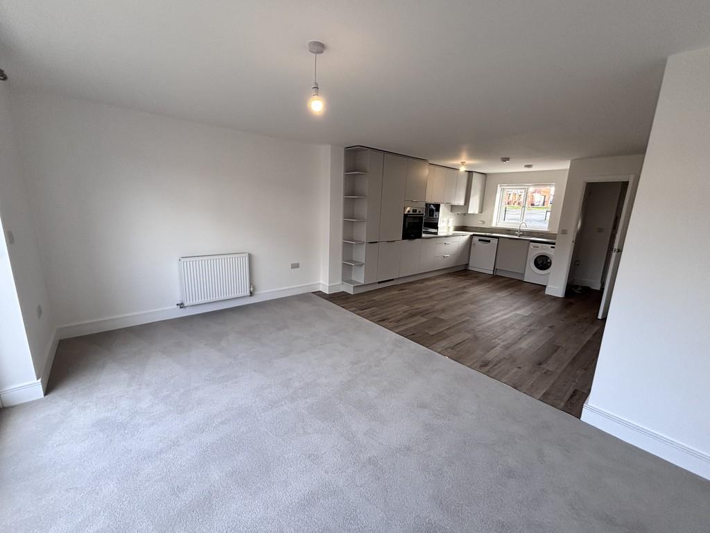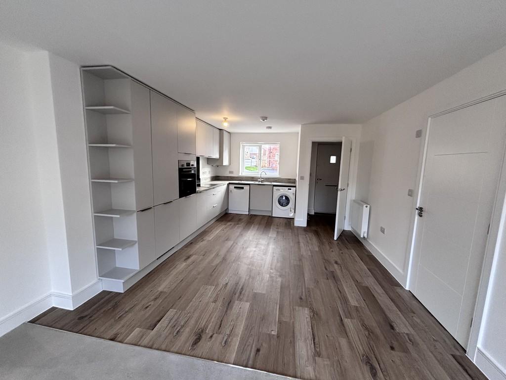 The ground floor features a bright and spacious open-plan living area, seamlessly combining the lounge, dining space and a stylish fitted kitchen. The kitchen is finished in a sleek, modern design and includes integrated appliances, providing both practicality and a clean aesthetic. French doors from the living area open directly onto the enclosed rear garden, creating a fantastic space for entertaining or relaxing. A convenient downstairs WC completes the ground floor.