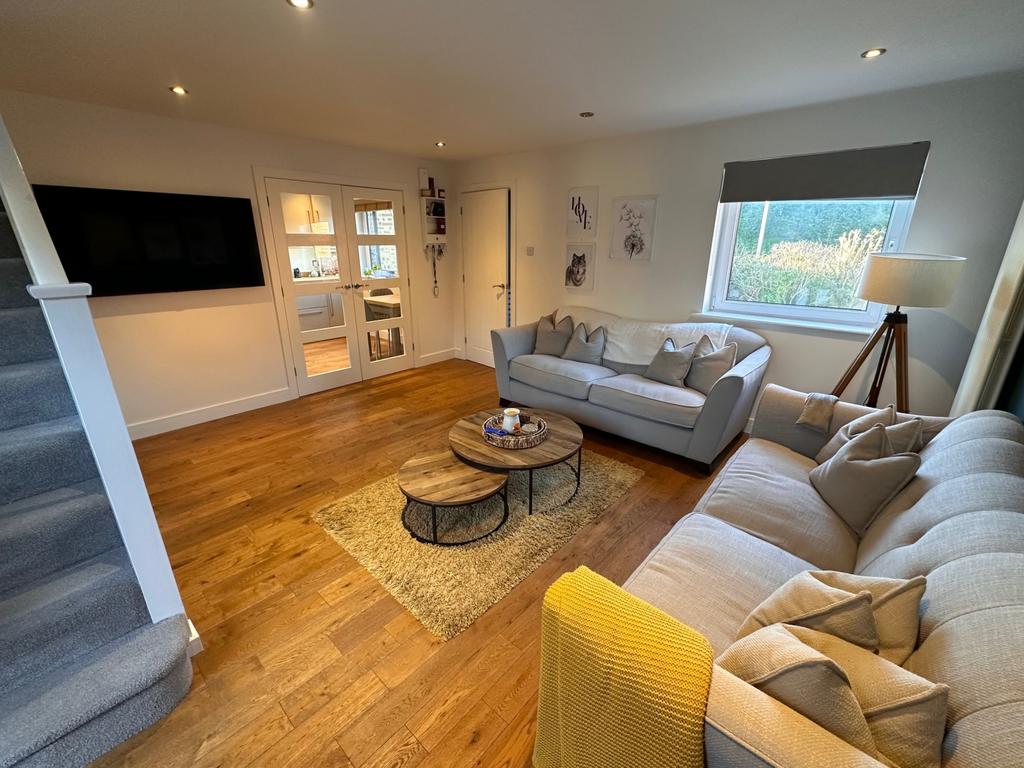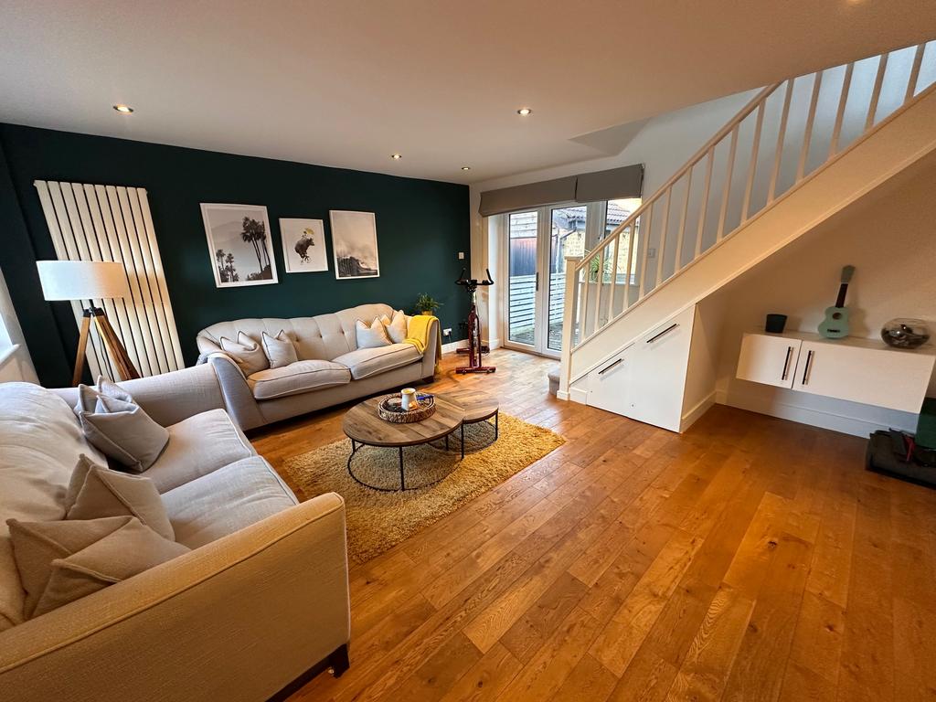 LIVING ROOM: - (15'6 x 14'7) Dual aspect, continuation of real wood flooring, double doors to garden, double glazed windows, television point, stairs to landing, understairs storage, double door through to:-