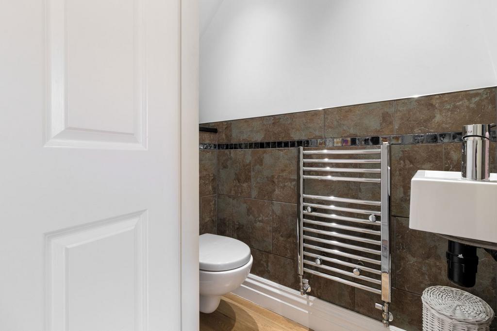 Hardwood flooring with underfloor heating, partially tiled walls, sensored spotlights, extractor fan, close coupled WC, wall mounted wash hand basin, chrome heated towel rail.
