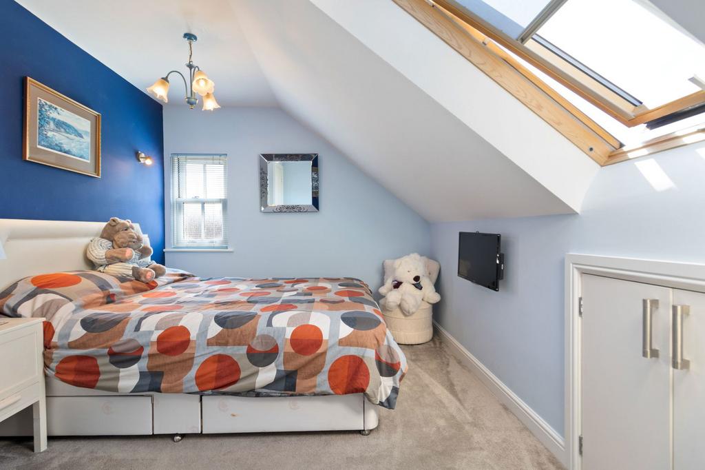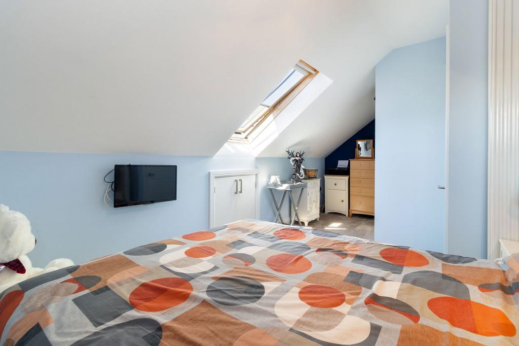 Carpet, radiator, obscure double glazed window to side with Velux rooflight with view to hills. Built in eaves storage, two wall lights and pendant light fitting.