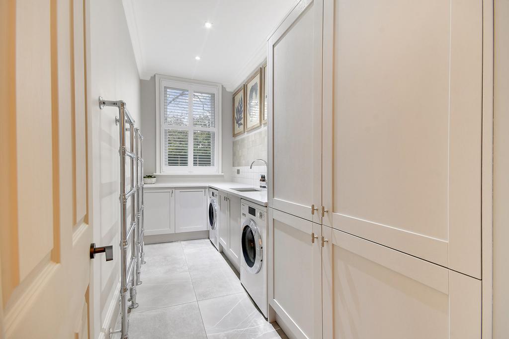 The ground floor is designed for both family life and entertaining. A formal sitting and dining room showcase elegant period proportions, while a separate cinema room provides the perfect retreat. The showpiece lies to the rear of the house where you find this remarkable dual-aspect open-plan kitchen/dining/family area. Here you have south west facing French doors and windows, a contemporary corner window and bi-fold doors that all flood the space with natural light. Here, a Wolf range cooker, bespoke cabinetry, bar area and an ingenious pantry unit (with hidden storage for appliances) create a kitchen of rare quality.