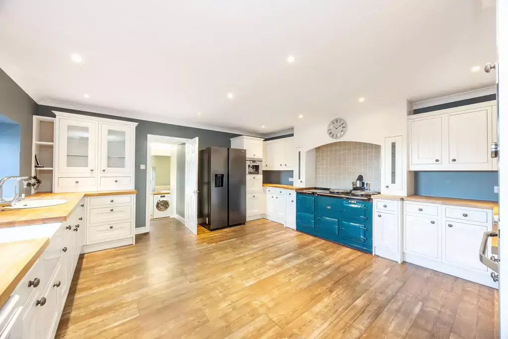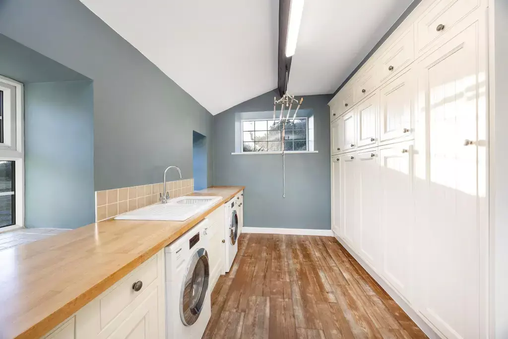 Appliances Oil fired Aga, electric oven, combi-oven, 4-ring hob, fridge freezer, coffee machine, dishwasher, washing machine and a dryer