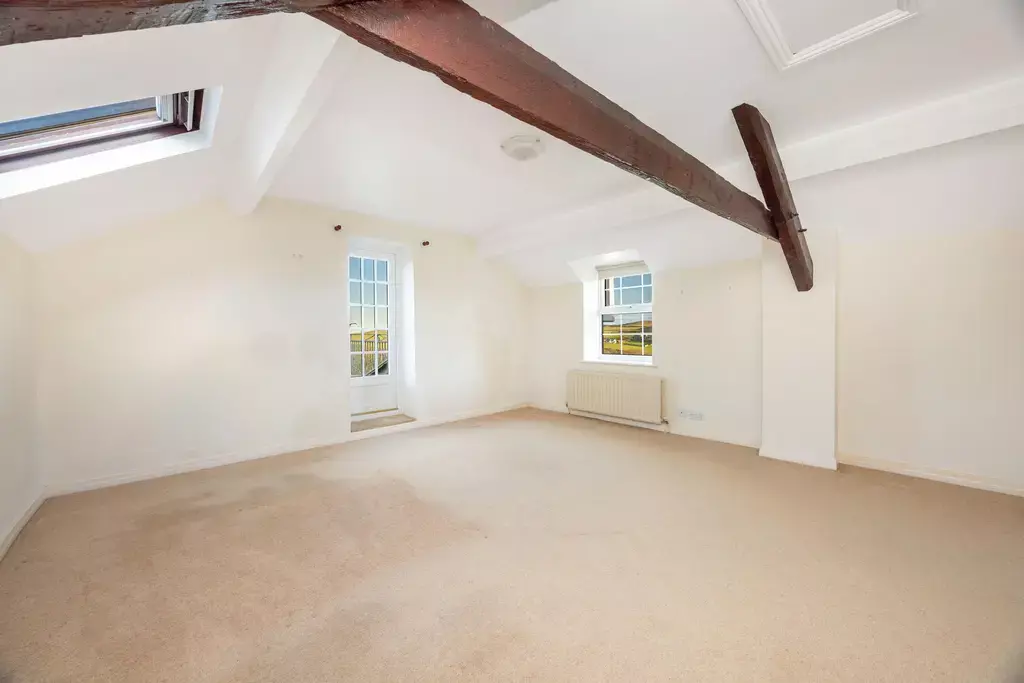 The two-bedroom apartment is positioned above the detached triple garage block with workshop and is notably light and airy throughout. It offers a spacious living and dining room, kitchen, and two bedrooms, both with en-suite facilities - one shower room and one bathroom. The apartment enjoys attractive open views across the surrounding countryside.
