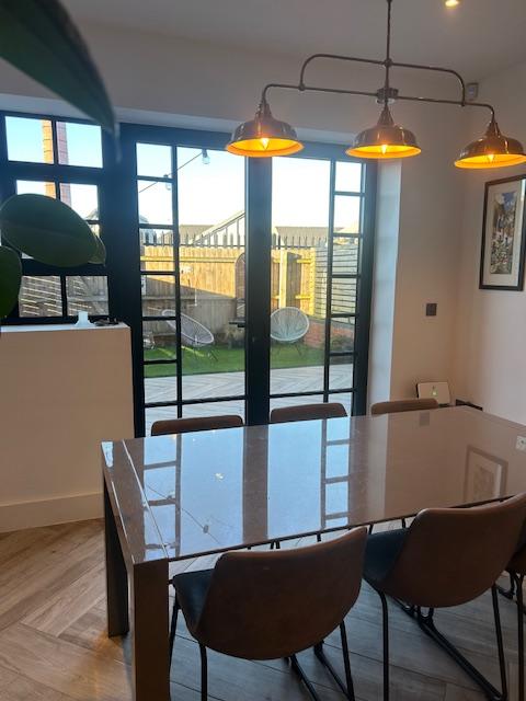 The stylish red brick frontage of the property leads into a very welcoming reception hall with feature hardwood floors, and stylish glass framed staircase. Off the hallway is the stunning family kitchen dining room. This large designer kitchen is extremely well equipped and very well laid out. The kitchen area has a large central seating island, with stylish hardware and all the modern conveniences of a designer kitchen. With double ovens, induction hob and extractor, wine fridge, fridge freezer and dishwasher. The dining area is a good size easily accommodate a 6 seater dining table and chairs with French doors opening onto the sizable rear gardens. Perfect for entertaining or relaxing with a BBQ.