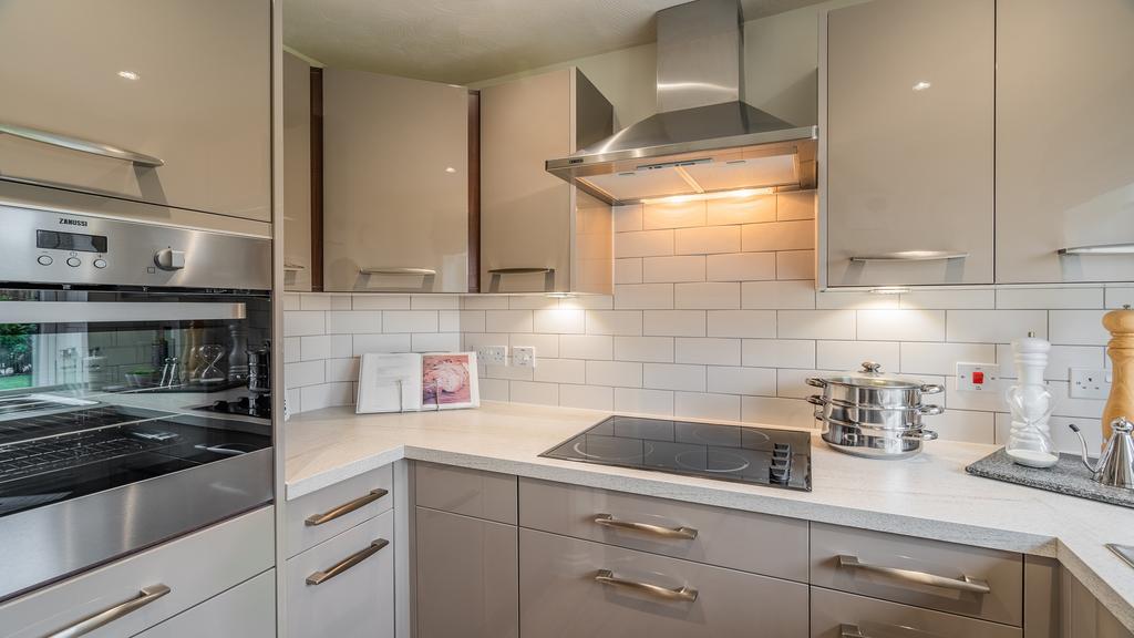 Kitchens are tiled with colour-coordinated worktops, and come with integrated appliances.