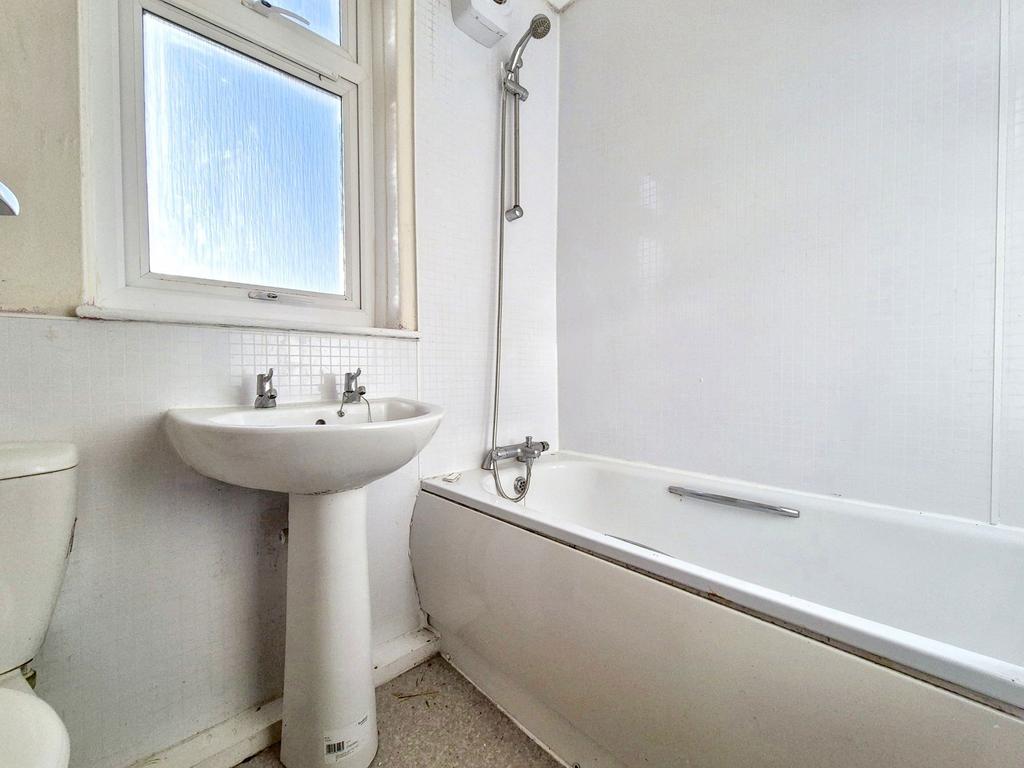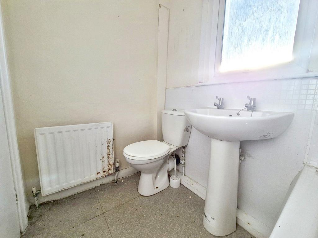 A suite comprising: Bath with mains shower over, pedestal wash hand basin, w.c, gas central heating radiator, double glazed window to rear aspect;