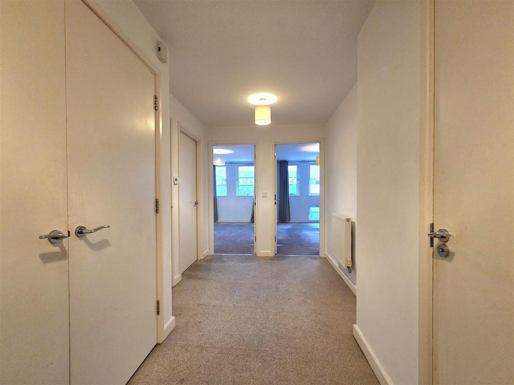Entrance Hallway - Spacious entrance hallway with carpeted flooring provides access to two built-in storage cupboards, one offering plumbing for an automatic washing machine, aswell as both bedrooms, family bathroom and living room.