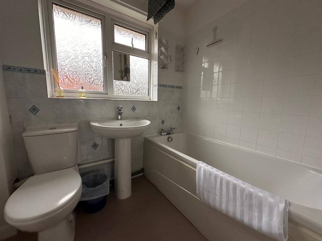 BATHROOM: - Rear aspect, three-piece suite comprising low level WC, panel enclosed bath with independent shower, pedestal wash hand basin, tiled walls, heated towel rail and double-glazed window.
