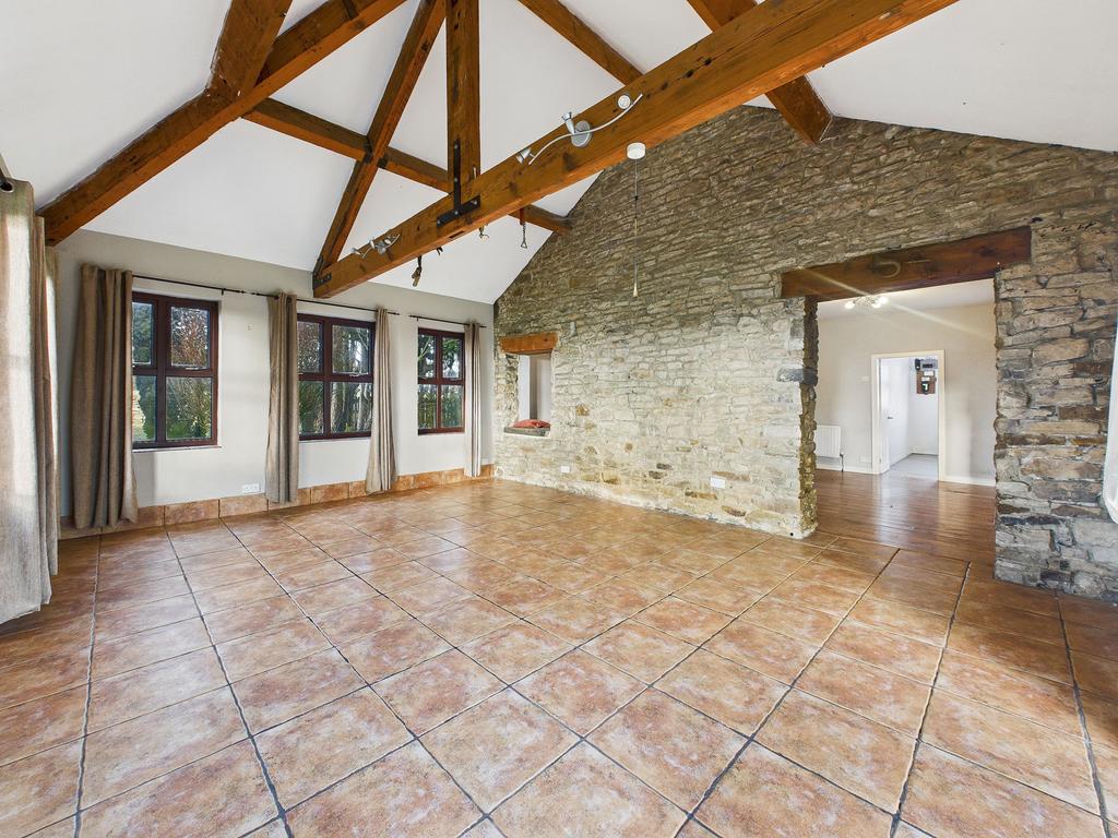 Double glazed rear and side aspect windows, double glazed patio doors leading out to the rear garden, vaulted ceiling with exposed wooden beams, exposed stone walls, tiled floor,