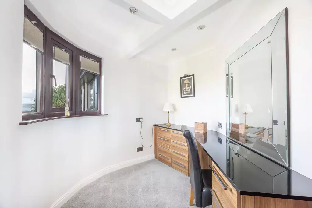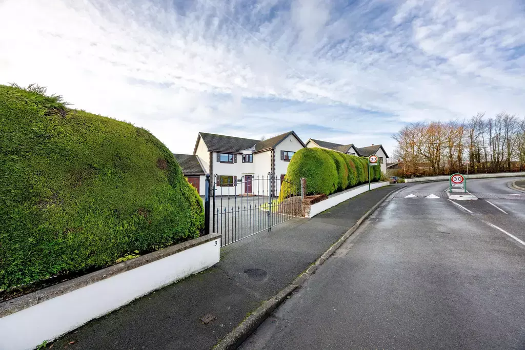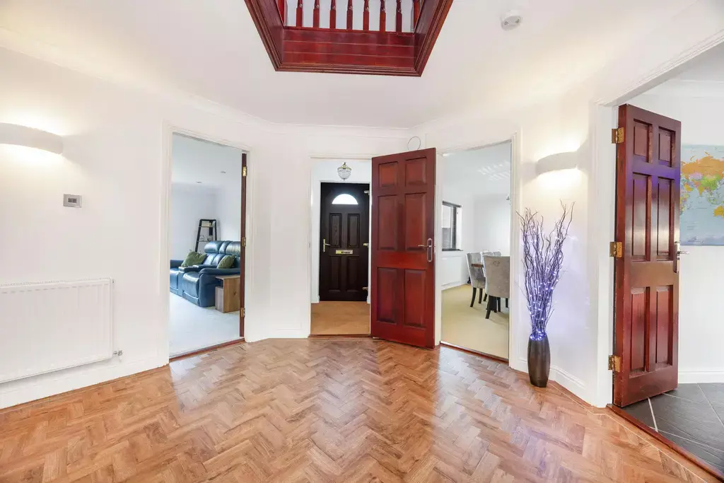 Nestled within a deceptively large plot, the property enjoys gated access and mature borders, creating a high degree of privacy rarely found in such a convenient location. The home boasts a unique and striking design, centred around a feature heptagon entrance hallway and galleried landing, which immediately sets the tone for the spacious and individual accommodation throughout.