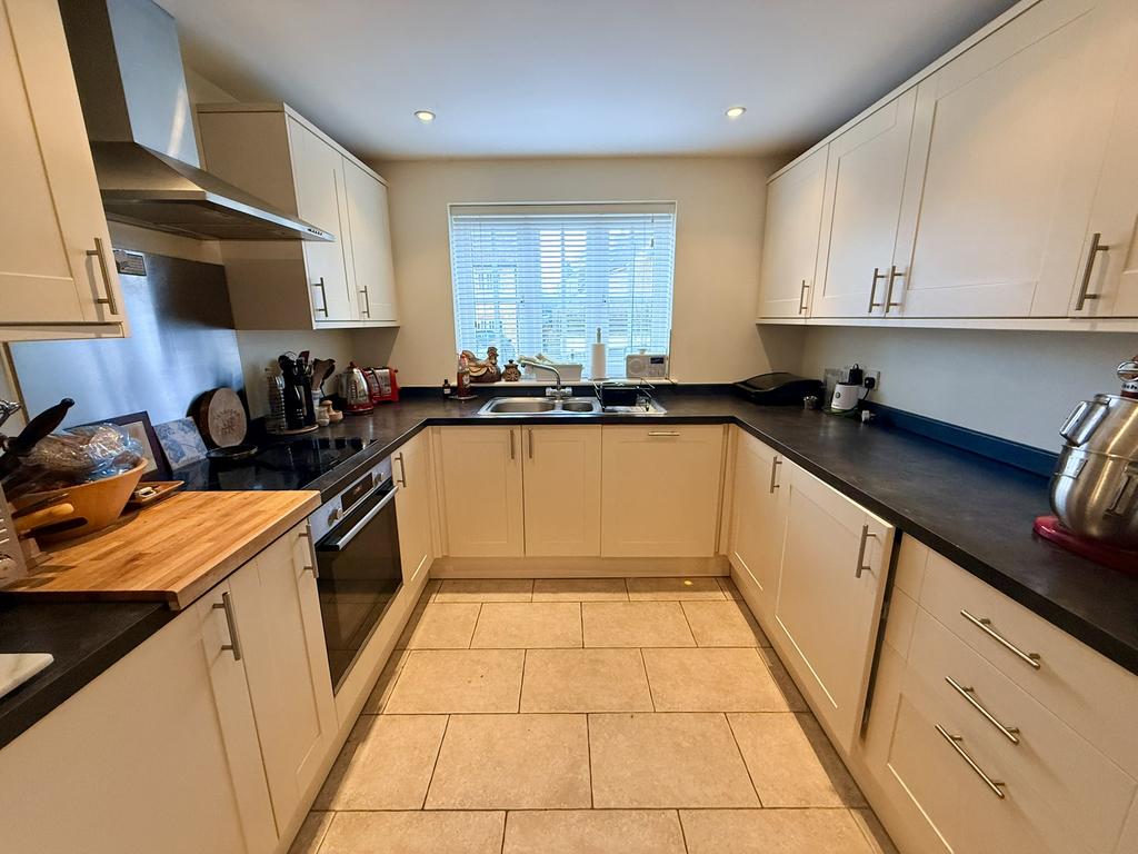 A stylish fitted kitchen comprising inset 1 1/2 bowl single drainer stainless steel sink unit with cupboard below, further range of matching wall, drawer and base units with working surface over, built in electric oven with inset ceramic hob and stainless steel cooker hood over, built in dishwasher and fridge/freezer, tiled floor, double glazed window to front aspect, smooth plastered ceiling with downlighters, room temperature control.