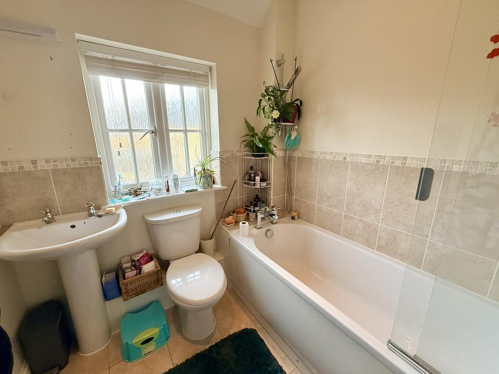 White suite comprising low level WC, pedestal wash hand basin with tiled splashback, obscure double glazed window to front aspect, tiled floor, smooth plastered ceiling and extractor.