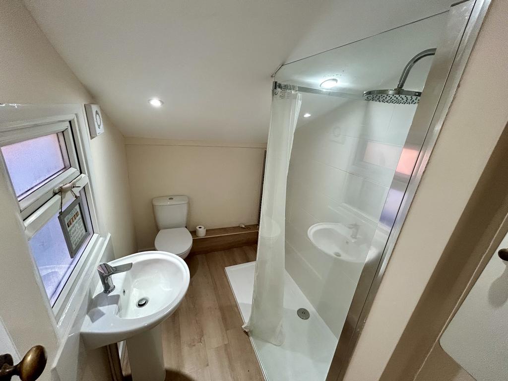 A stunning brand new shower room with large walk in shower, pedestal basin and WC.