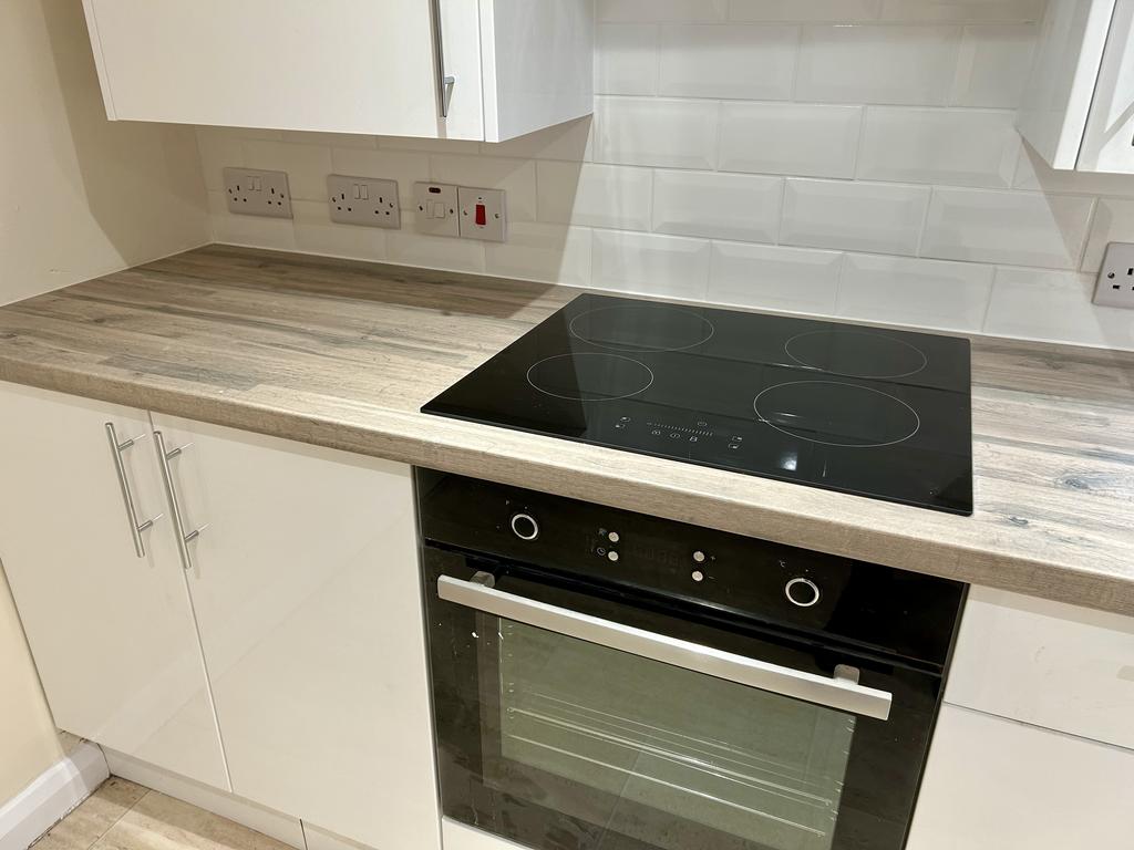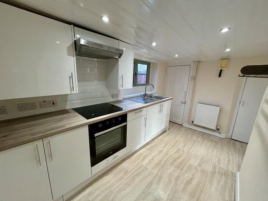 A beautiful brand new modern kitchen, with white high gloss units and a walnut effect worktop, new laminate flooring.