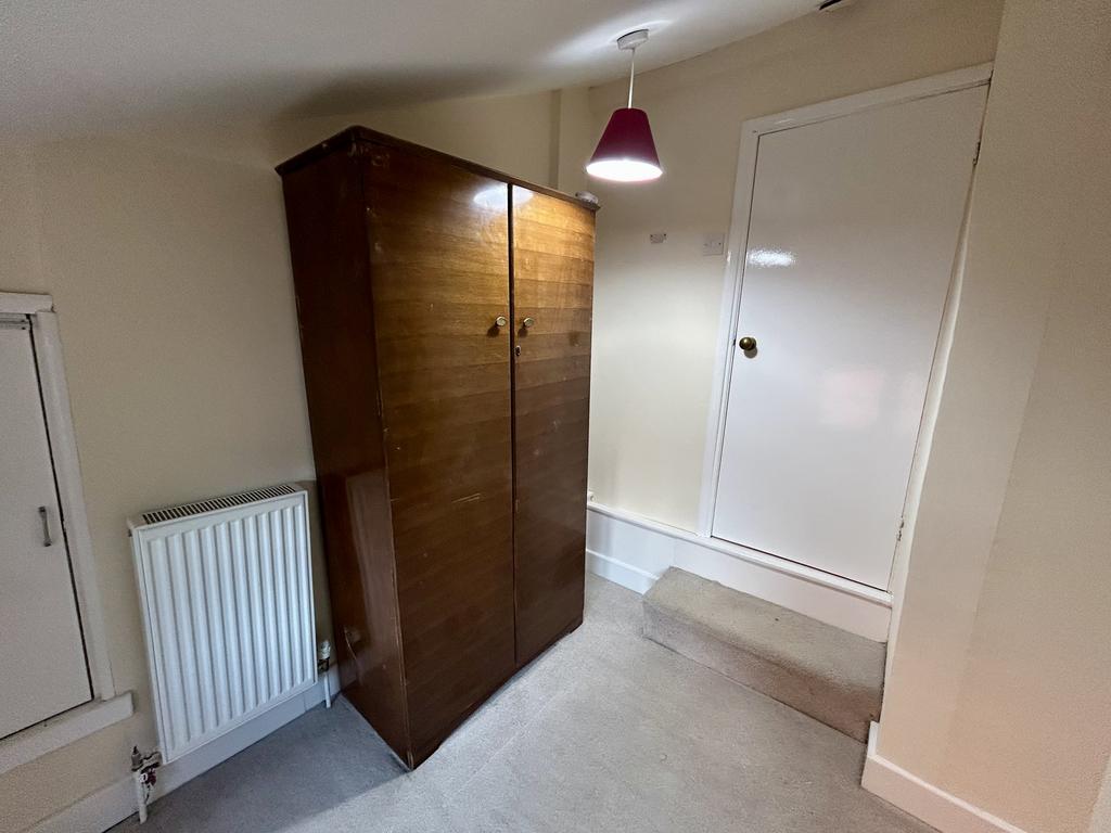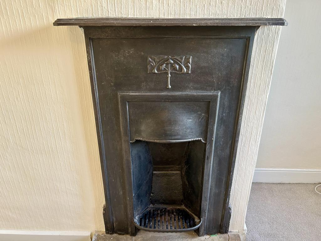 A spacious room situated to the front of the property with an ornate fireplace and storage cupboard.
