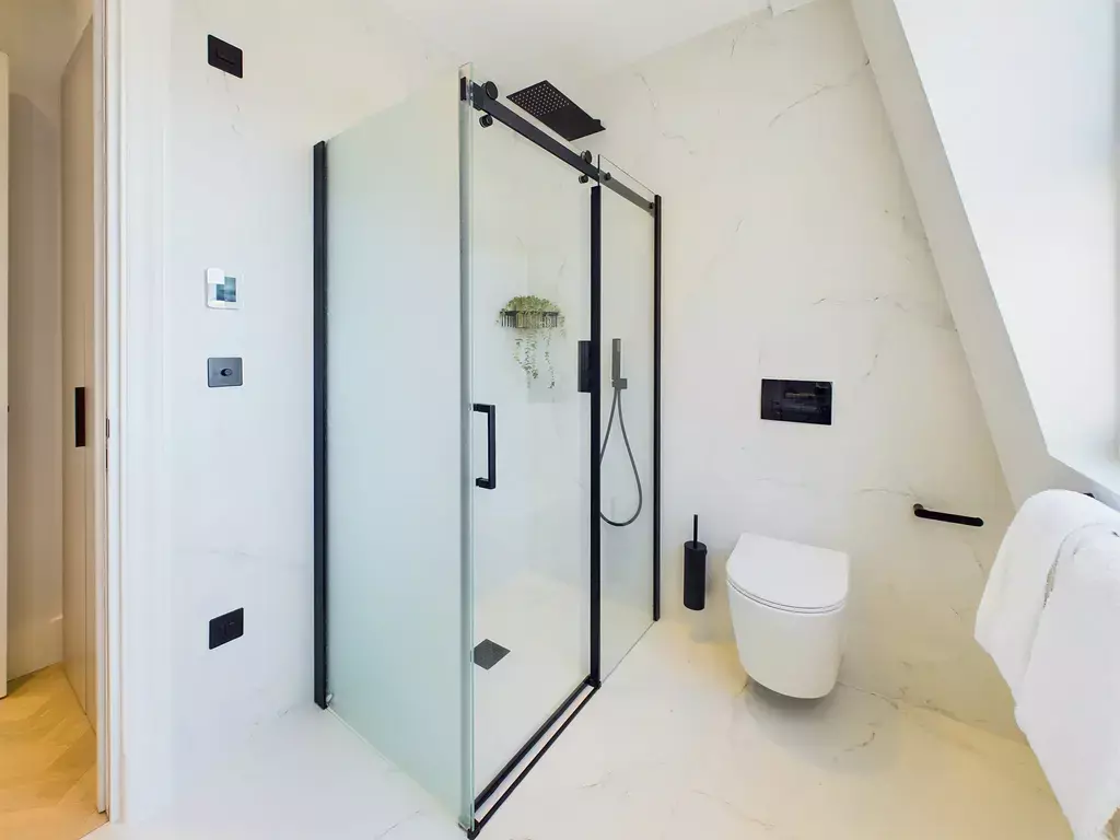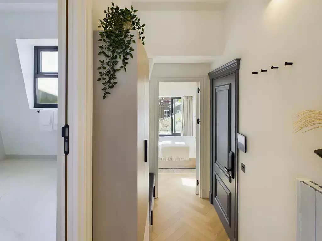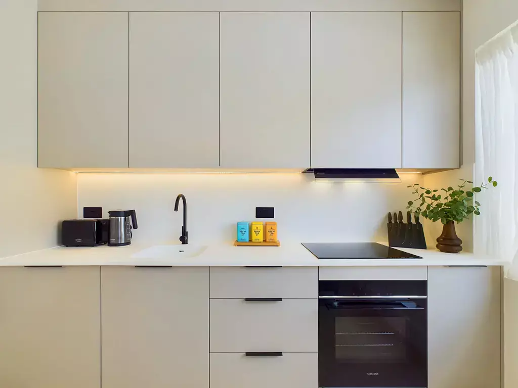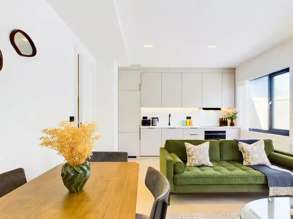 This beautifully designed penthouse apartment features a bright open-plan living, dining and kitchen area, flooded with natural light to create a warm and welcoming space. The lounge includes a comfortable sofa and Smart 4K TV, while a wooden dining table seats four. The sleek, modern kitchen is fully equipped with high-end appliances, including a Nespresso machine.