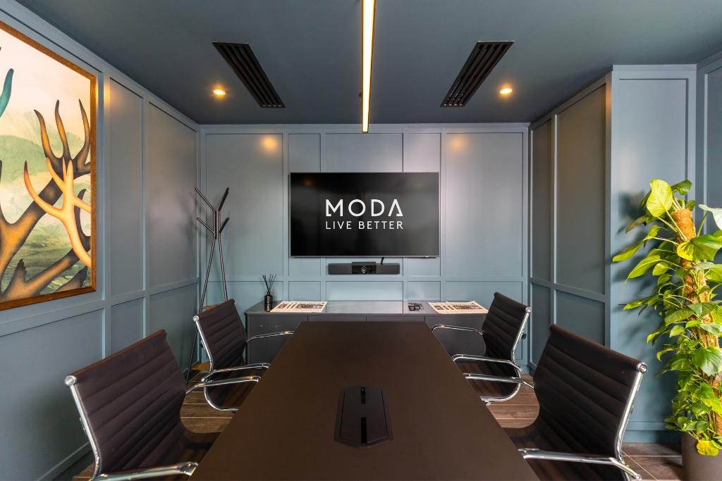 Light and spacious with floor to ceiling windows and Herringbone blackout curtains. Two plus deep-seated sofas, media storage and nested coffee tables with mirrored top.