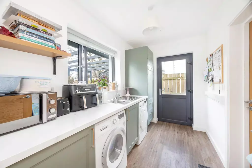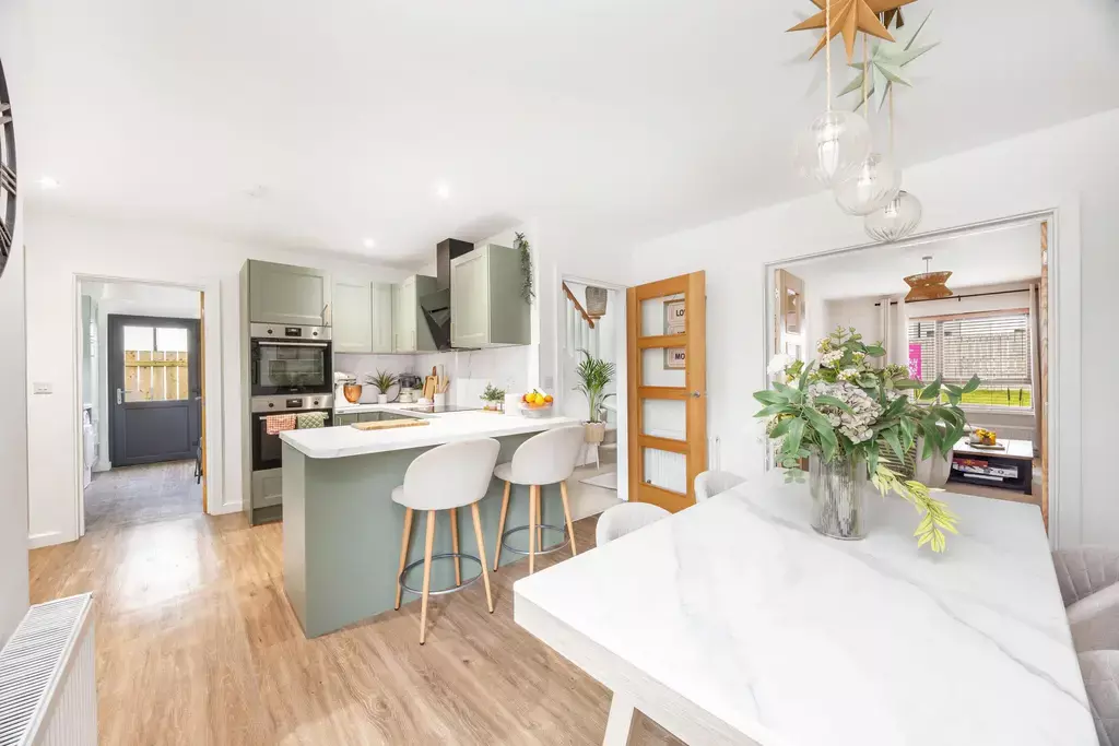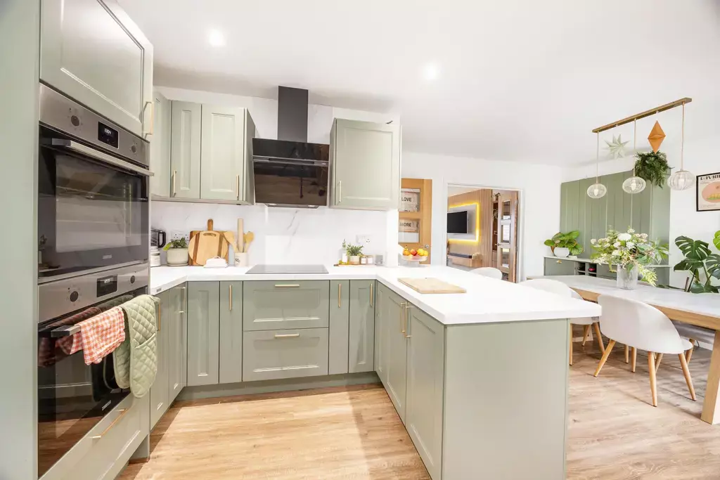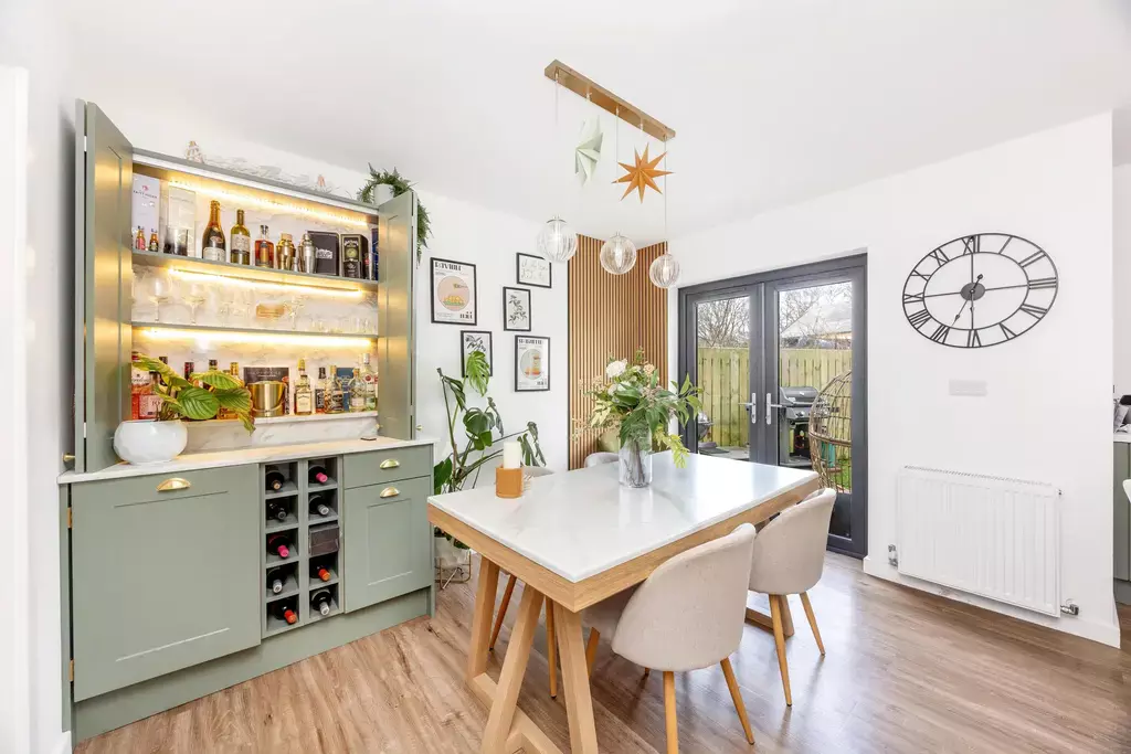 The accommodation opens with an entrance porch leading into a welcoming reception hall with a useful storage cupboard and a cloakroom (WC). A stylish living room provides a relaxing retreat and features double doors opening into the stunning dining kitchen, creating a wonderful flow for both everyday living and entertaining. The kitchen is truly a standout feature, having been upgraded to a bespoke specification with custom cabinetry, upgraded handles and worktops, two integrated ovens instead of one, a Quooker boiling hot water tap, and a bespoke bar area complete with feature lighting. A matching utility room offers further storage, including a larder unit, and provides integral access to the attached garage.