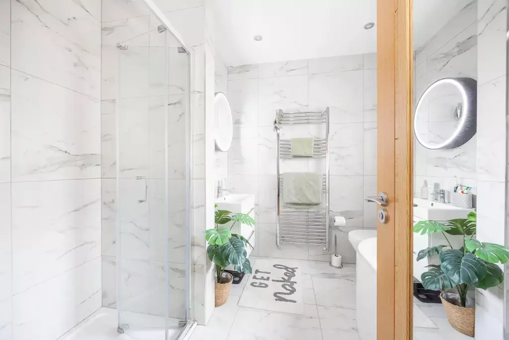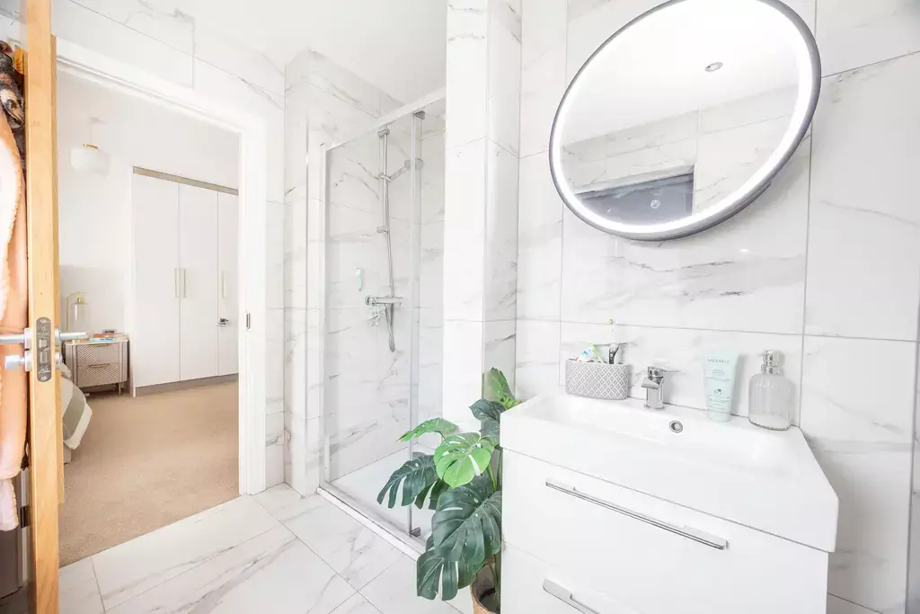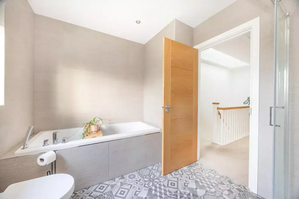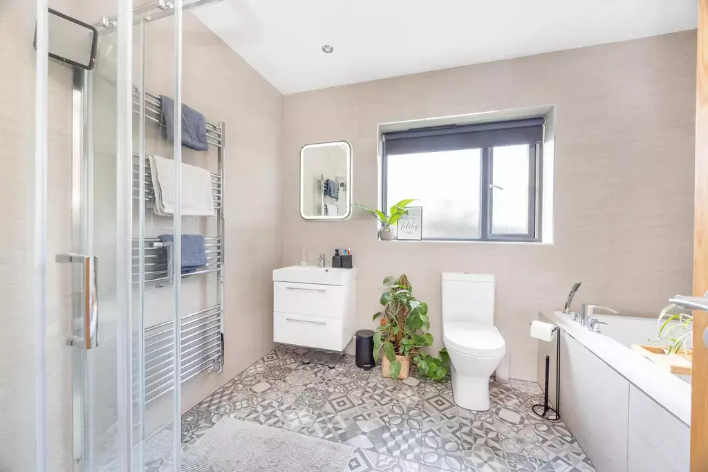 To the first floor are four generous double bedrooms. The principal bedroom benefits from a luxurious en suite shower room finished with marble-style tiling, while the family bathroom is equally impressive, featuring patterned floor tiles and both rooms enjoying the rare advantage of separate bath and shower facilities.