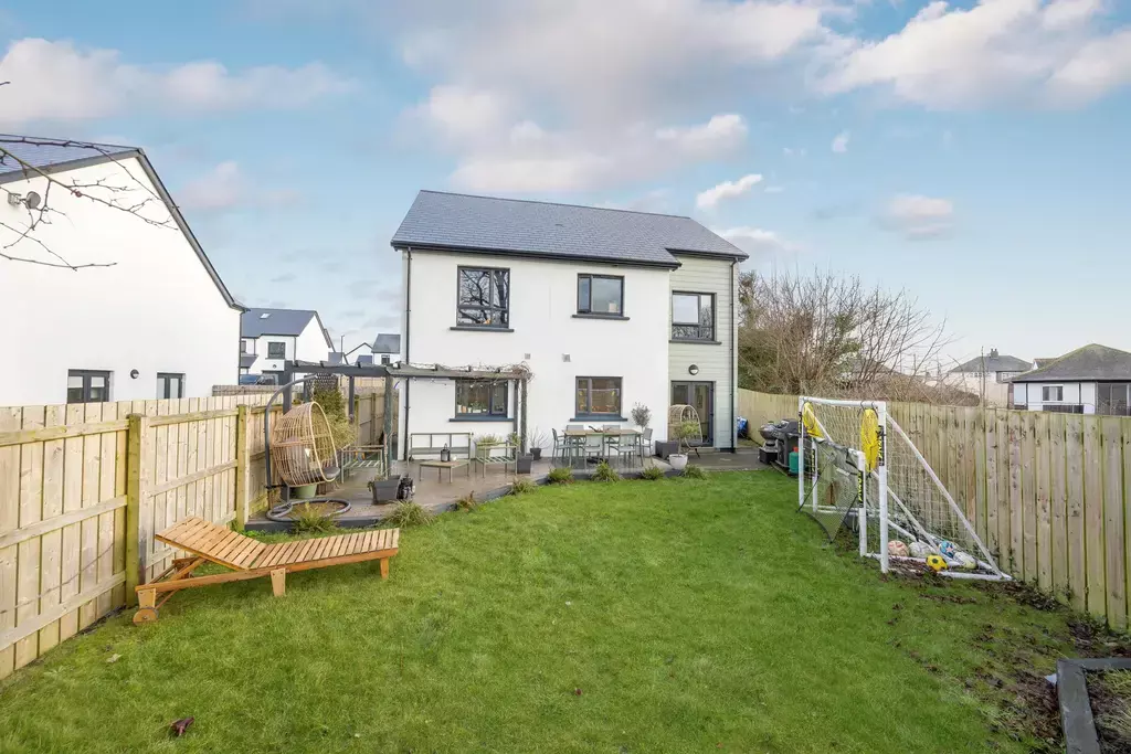 Externally, the property continues to impress. To the front, an attractive block-paved driveway provides off-road parking and access to the integral garage. The large corner plot offers excellent outdoor space, with the rear garden mainly laid to lawn, complemented by a paved patio area and a substantial composite decked terrace with pergola—ideal for outdoor dining and entertaining. An additional large landscaped area sits to the side of the property, and the plot backs onto the historic Isle of Man Steam Railway, adding a unique and charming backdrop.