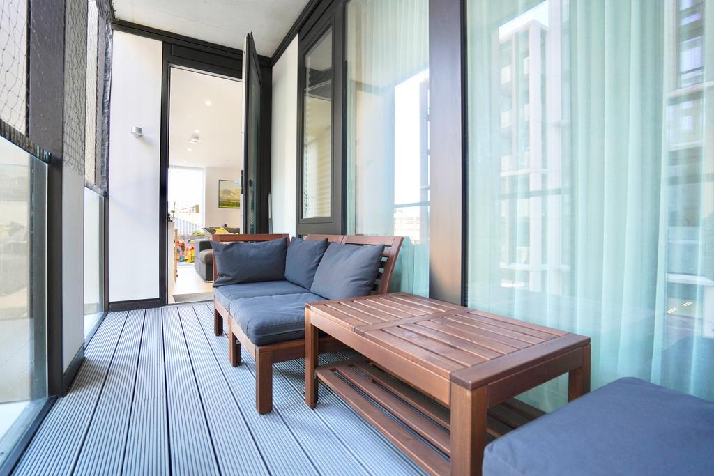 The property features a bright open-plan kitchen/living area with integrated appliances, floor-to-ceiling windows, and a private balcony overlooking Perceval Square.