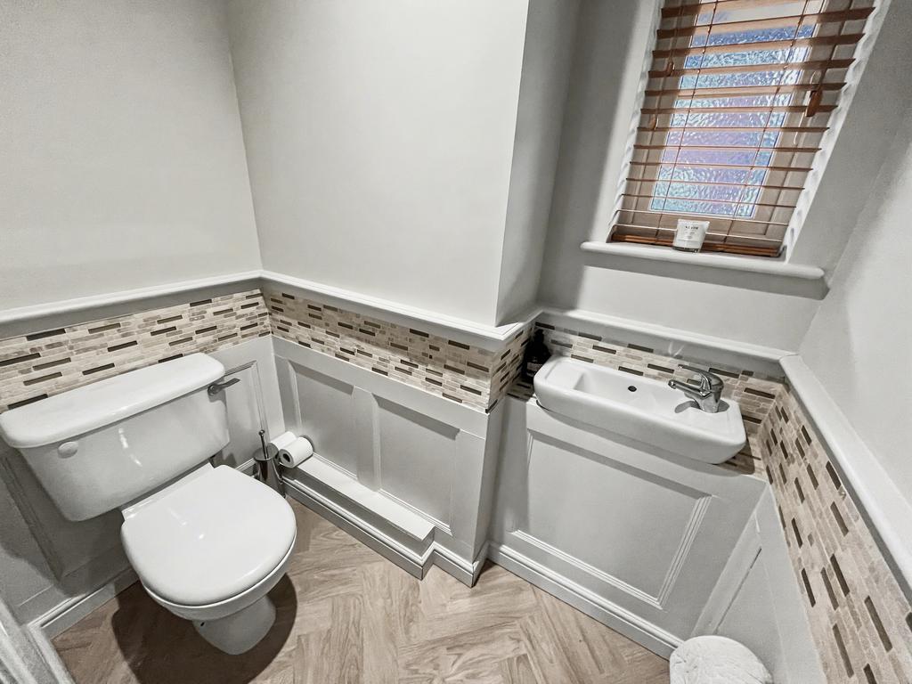 The ground floor comprises a bright and generously sized living room, providing a comfortable space for relaxing and entertaining. The high spec fitted kitchen offers ample storage and worktop space, with the benefit of being open to a dining area which overlooks the rear garden. A decorative and practical utility room ensures further storage and laundry room whilst including an integrated washing machine. There is also a well finished WC/cloakroom on this ground floor.
