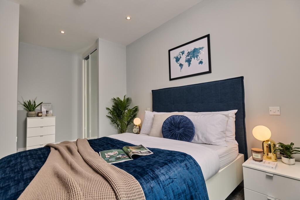 Stylish bedroom including walk in wardrobe, leading to your ensuite bathroom, hanging rail and storage. Ottoman bed features headboard with mattress, between two bedside tables.