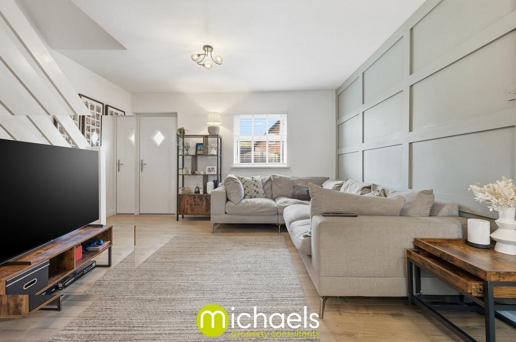 The property is immediately greeted by a warm and inviting reception room, featuring stylish wall panelling, LVT flooring, and stairs rising to the first floor. This space seamlessly opens into the focal kitchen/dining area, which boasts shaker-style units, a wealth of storage, a central island, integrated appliances, and access to a convenient utility room and a ground floor study/playroom.