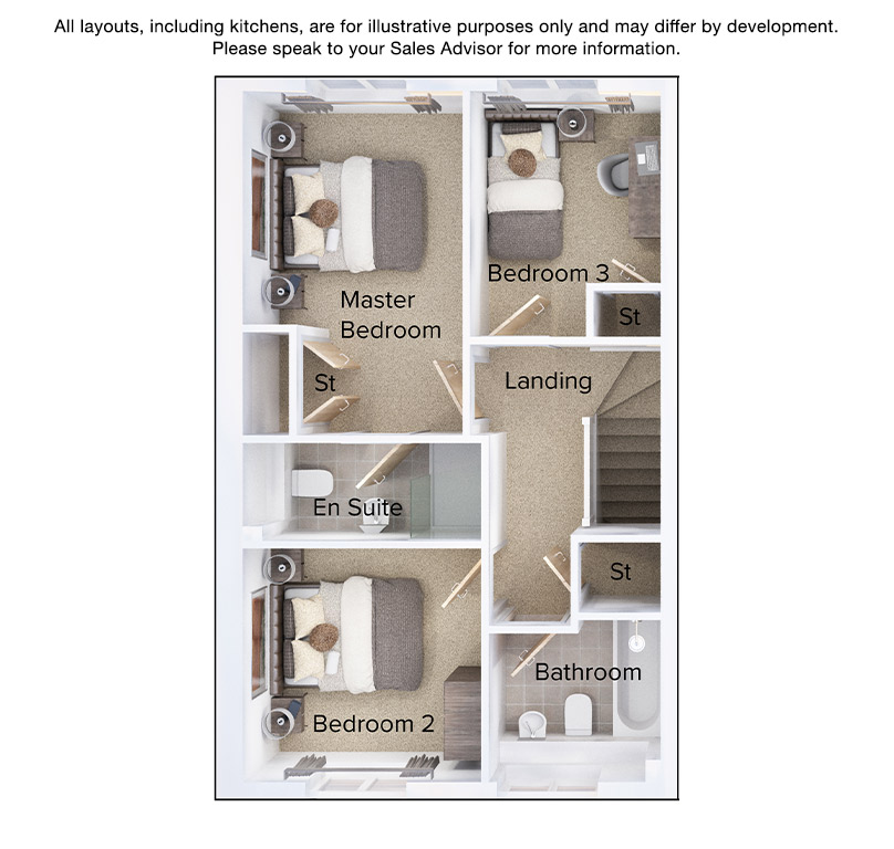 Artists' impressions are drawn from an imaginary viewpoint and are intended to give an impression of the house design. Photographs may be from Seddon Homes developments across the North West. Neither the artists' impressions nor the photographs are intended to give an accurate description of any specific property offered for sale, its setting or its surroundings. These do not show final details of gradients of land, boundary treatments, local authority street lighting or landscaping. We aim to build according to the layout, but occasionally we do have to change house designs, boundaries, landscaping and the positions of roads, footpaths, street lighting and other features as the development proceeds. Floor plans: The dimensions shown are approximate. Each home is built individually and so the precise measurements may vary from that shown, although every endeavour is made to make the dimensions as accurate as possible. We give maximum dimensions that may include fitted wardrobes, sloping ceilings, bay windows, and any other features. All layouts, including kitchens, are for illustrative purposes only and may differ by development. Please speak to your Sales Advisor for more information.