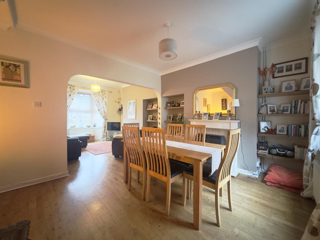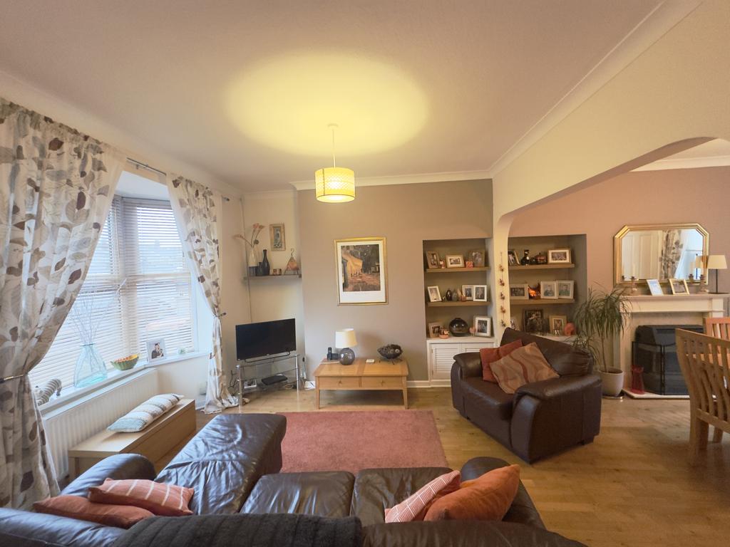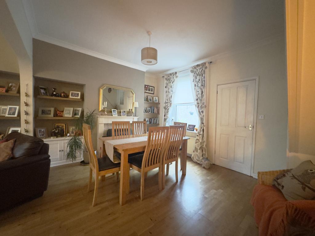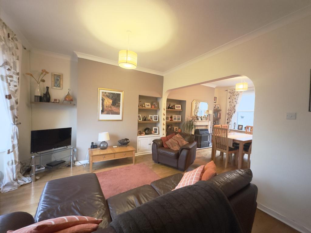 Number 23 is entered through an entrance porch. From here, a door opens into the lounge which is situated at the front of the house . It has oak flooring, which continues through to the dining area, creating a nice flow across the ground floor. A bay window to the front allows plenty of natural light into the room and adds extra space. There is recessed shelving with cupboards beneath, providing useful storage while keeping the room neat and uncluttered, an open doorway leads through to the dining area, making the space feel connected and sociable.