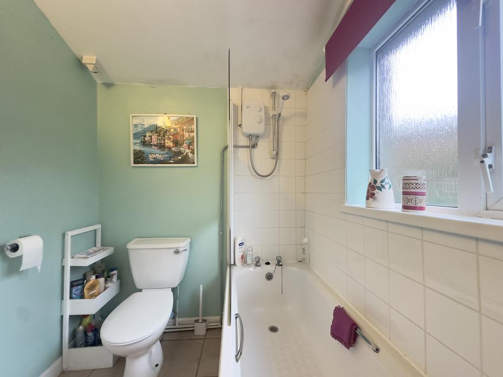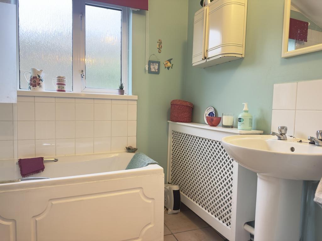The bathroom is fitted with a white suite, including a panelled bath with a shower over, a wash hand basin, and a low-level WC. The walls are part tiled, giving a clean and tidy finish. The room is well arranged and provides everything needed for daily use.