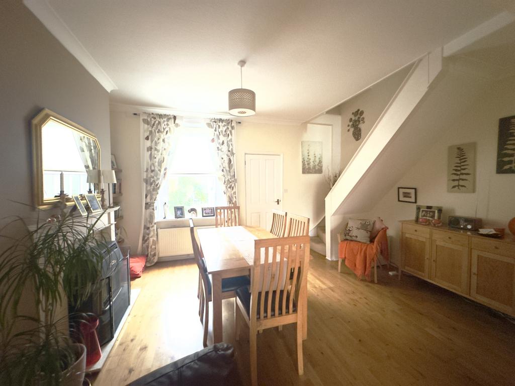 The dining area is a good size and works well for everyday meals as well as entertaining. The oak flooring continues here, and there is further recessed shelving with cupboards beneath, offering additional storage. A feature fire with an inset gas fire sits on a marble-effect hearth and acts as a focal point in this room. Stairs rise from the dining area to the first floor, positioned neatly so they do not take up unnecessary space.