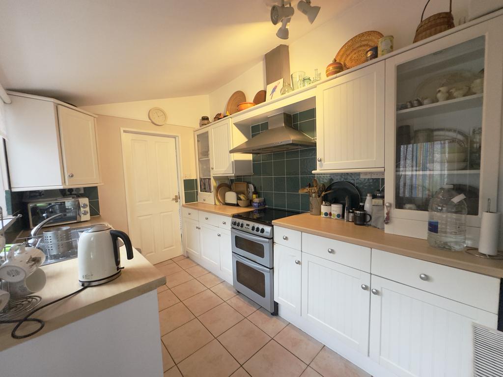 To the rear of the house is the fitted kitchen. This is a practical and well laid out space with a range of fitted wall and floor units and a china display cabinet with worktops over with an inset wash hand basin. There is space for a cooker, with a modern extractor fan fitted above, and the walls are finished with contrasting tiles. A china display cabinet provides extra storage and display space and there is tiling to the floor. A door from the kitchen leads out to the rear, making access outside easy and convenient.