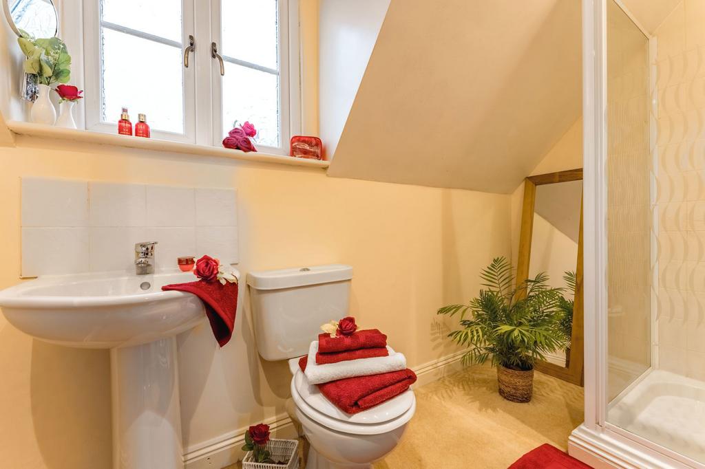 The en‑suite shower room is fitted with a white suite including WC, wash hand basin, heated towel rail and a shower cubicle with glass door.